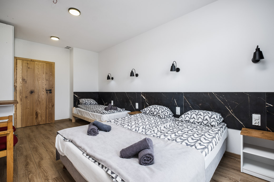 Wyposażenie: łóżko 160 cm sofa/łóżko dla dziecka powyżej 3 lat, prywatna łazienka (prysznic), ręczniki i kosmetyki, lodówka hotelowa, czajnik, kawa/herbata, TV, Wi-Fi.