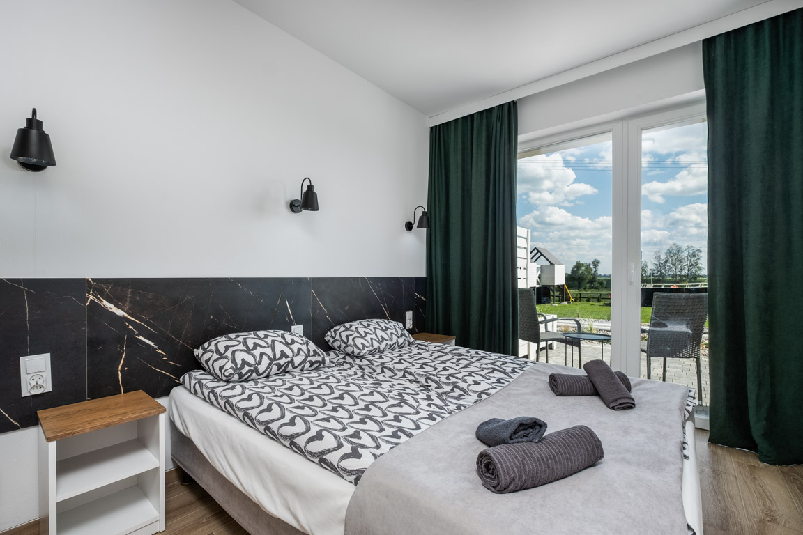 Wyposażenie: łóżko 160 cm, sofa/dostawka dla dziecka, lodówka, czajnik, kawa i herbata, ręczniki.